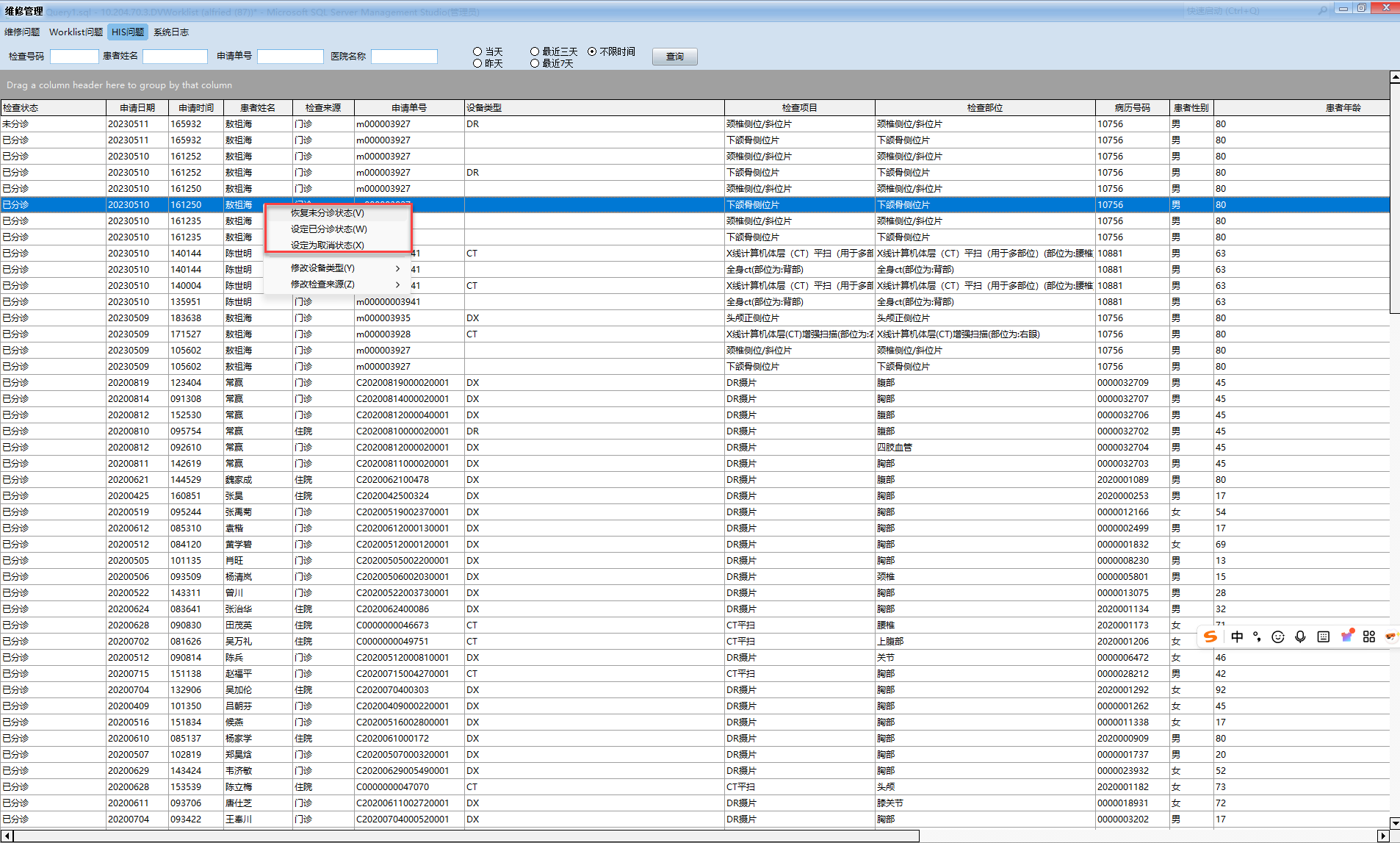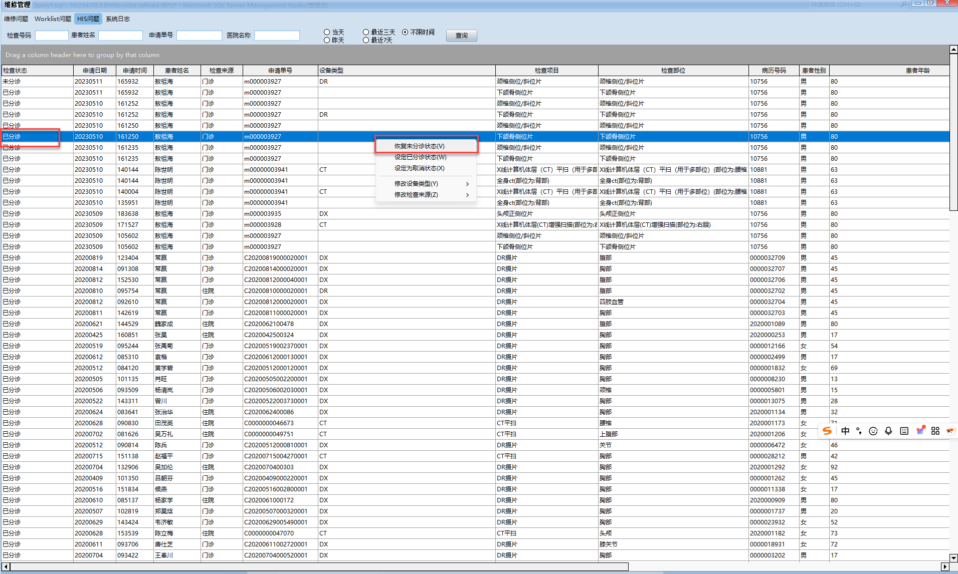 2 在确认的患者数据鼠标右键设定相关状态即可;