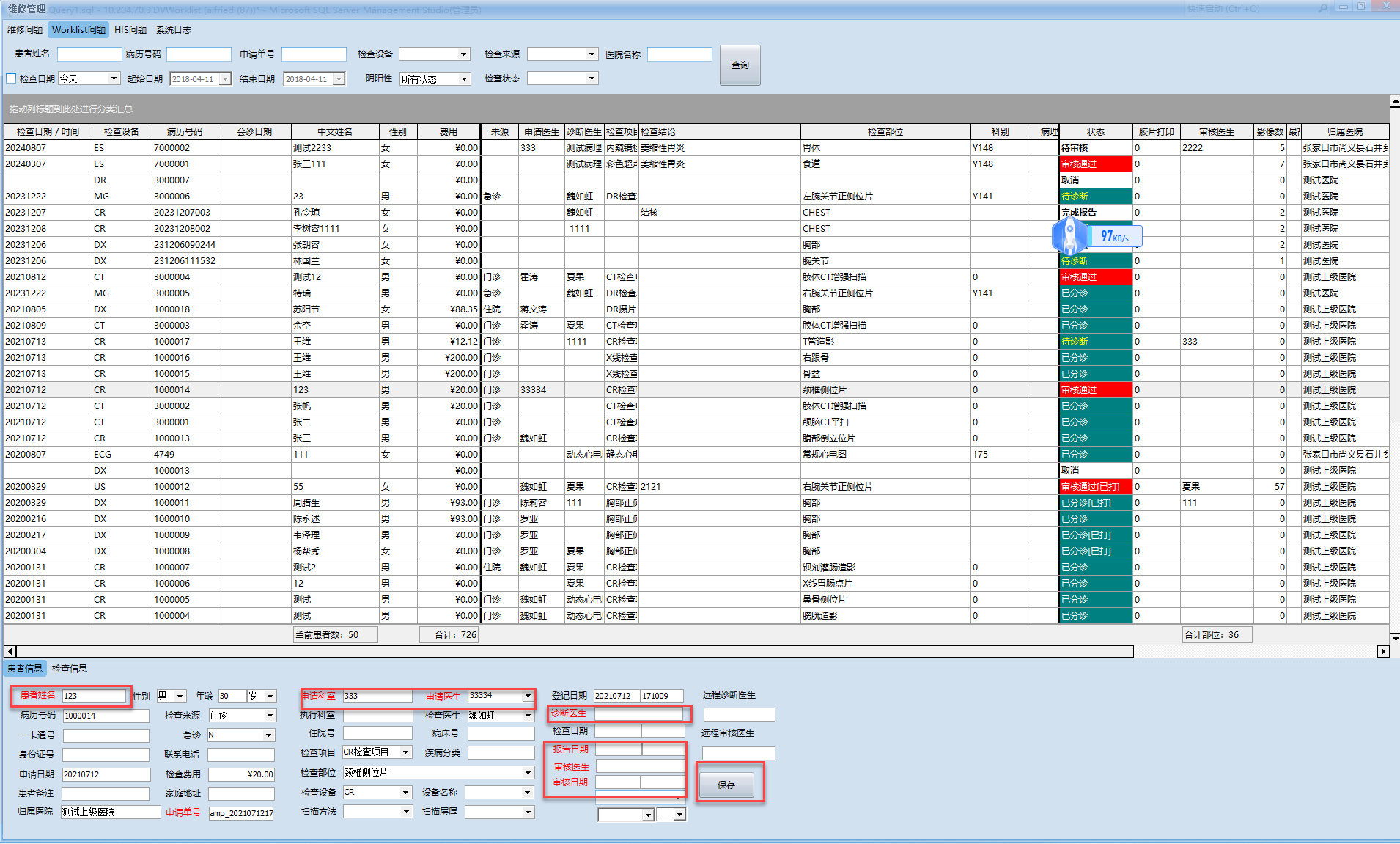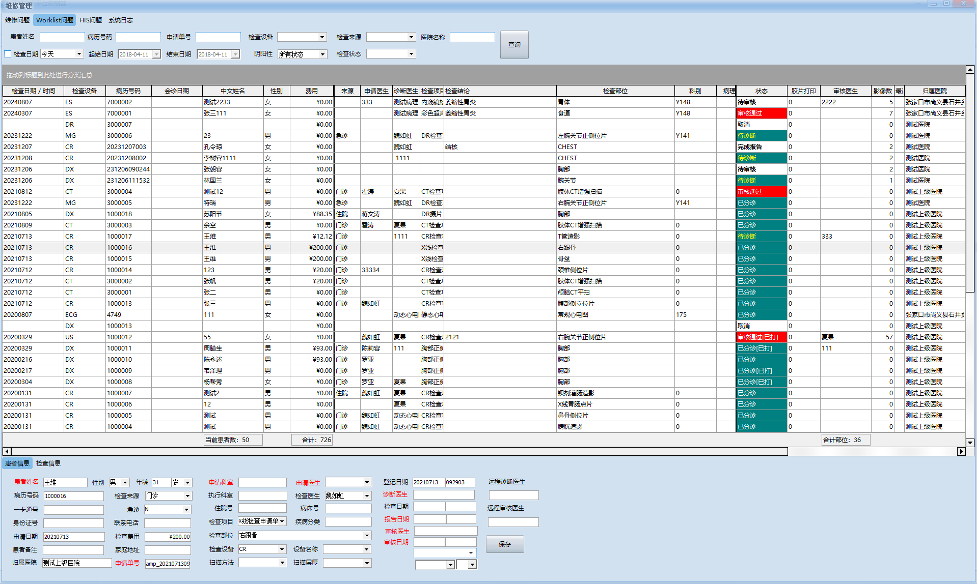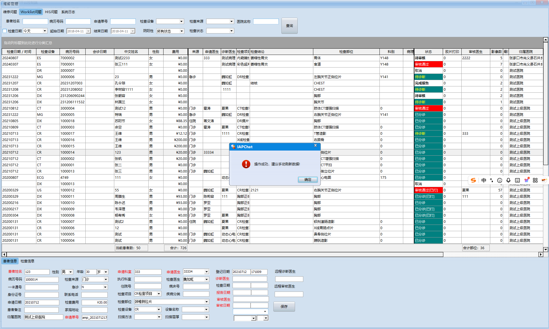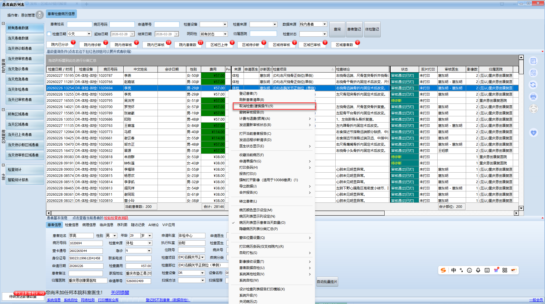 2 在主任权限下即可看到患者列表鼠标右键【取消检查】有此删除功能
