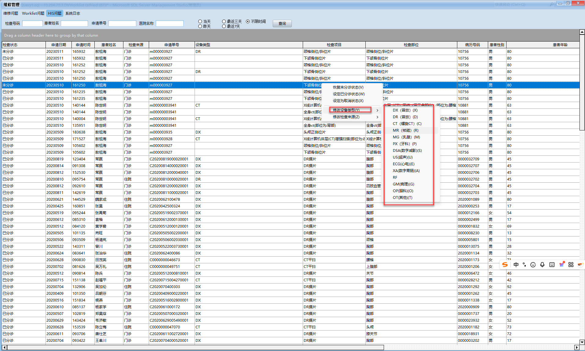 HIS患者检查设备类型修改方法(信息科专用)