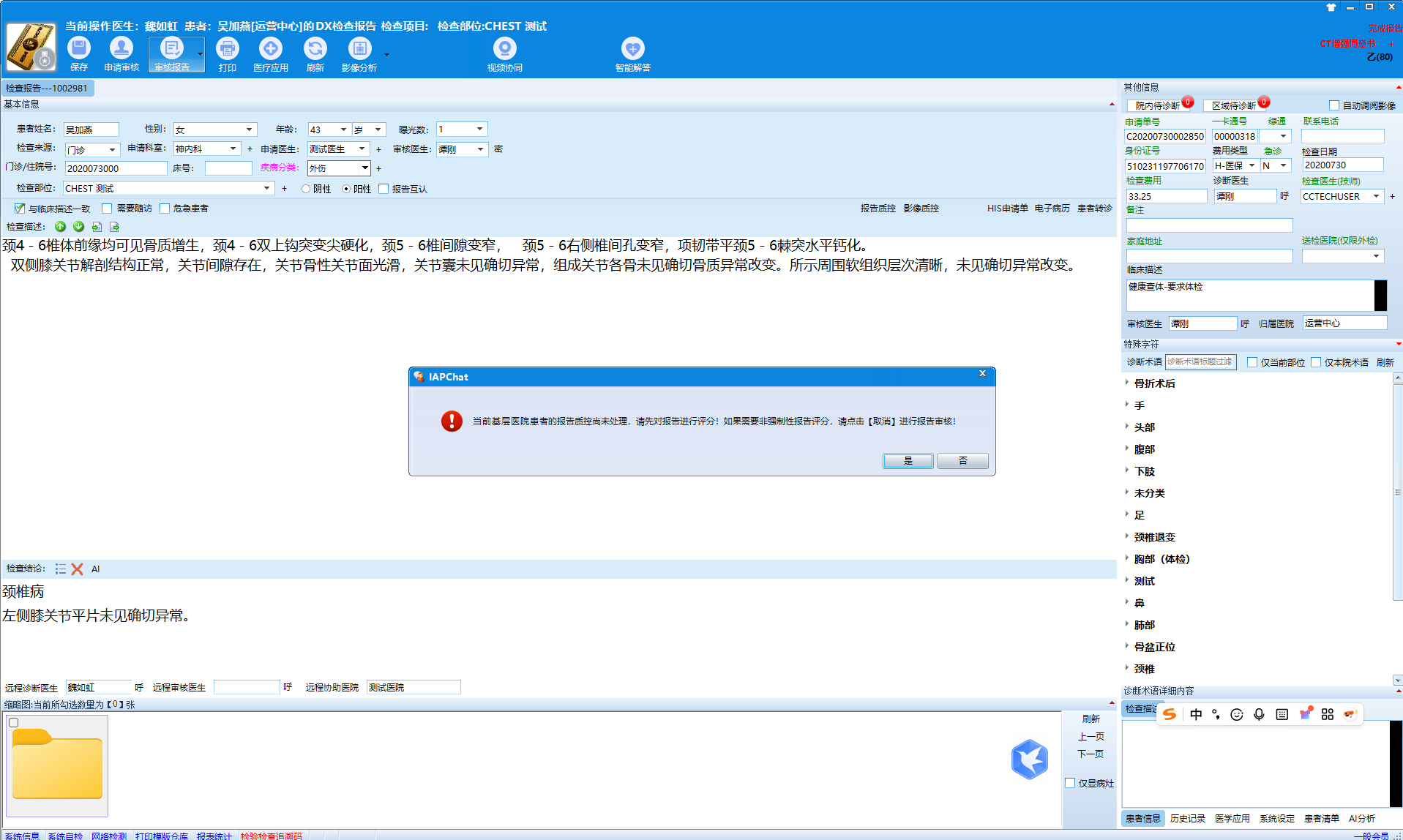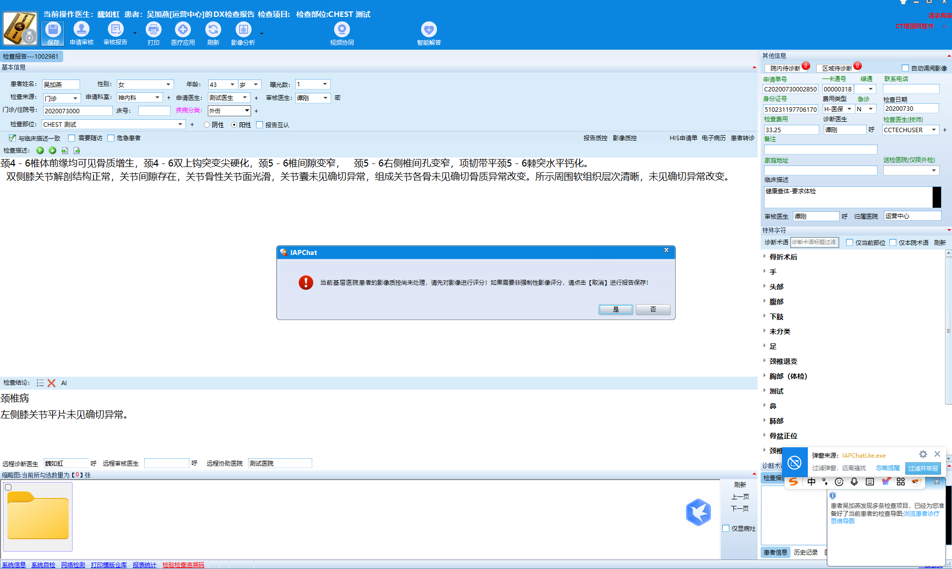 2 上级医生在书写基层医院报告的时候,如果没有进行影像质控评分会弹出提示。当然如果非强制性影像评分,可以选择【否】进行强制性保存报告;请看下图