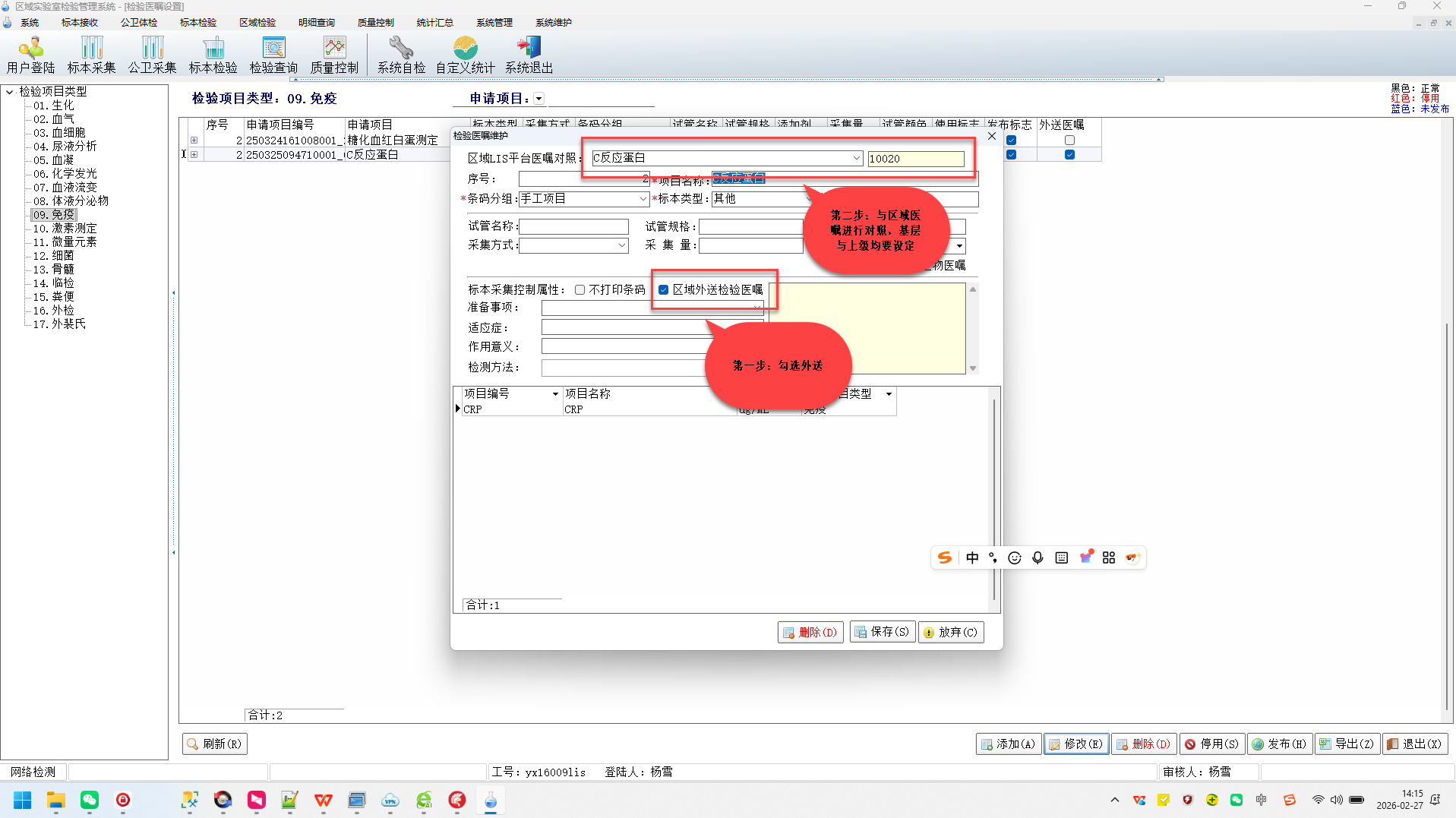 3 在主菜单【系统管理】下面的子菜单【检验医嘱】或者[微生物项目]下设定医嘱的是否支持外送以及对应区域LIS的医嘱代码;请看下图: