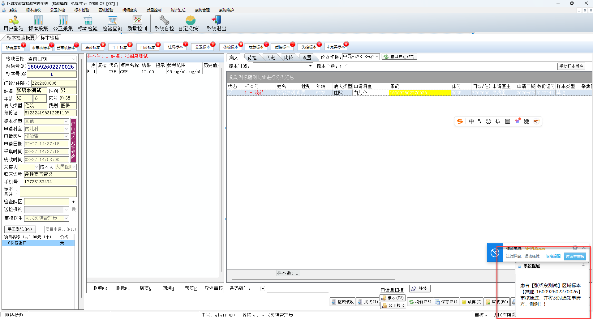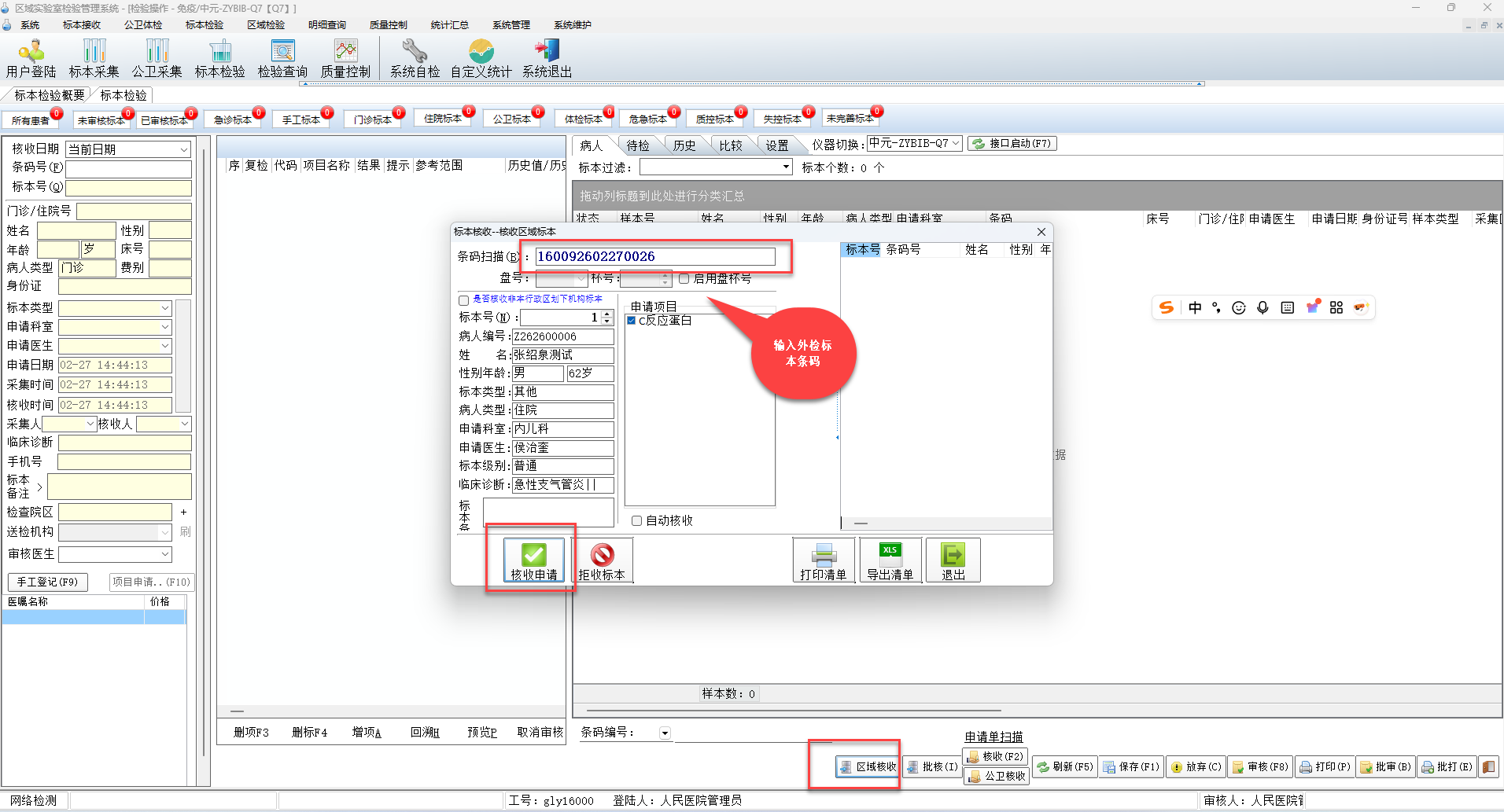 1 在【标本检验】模块进入【区域核收】